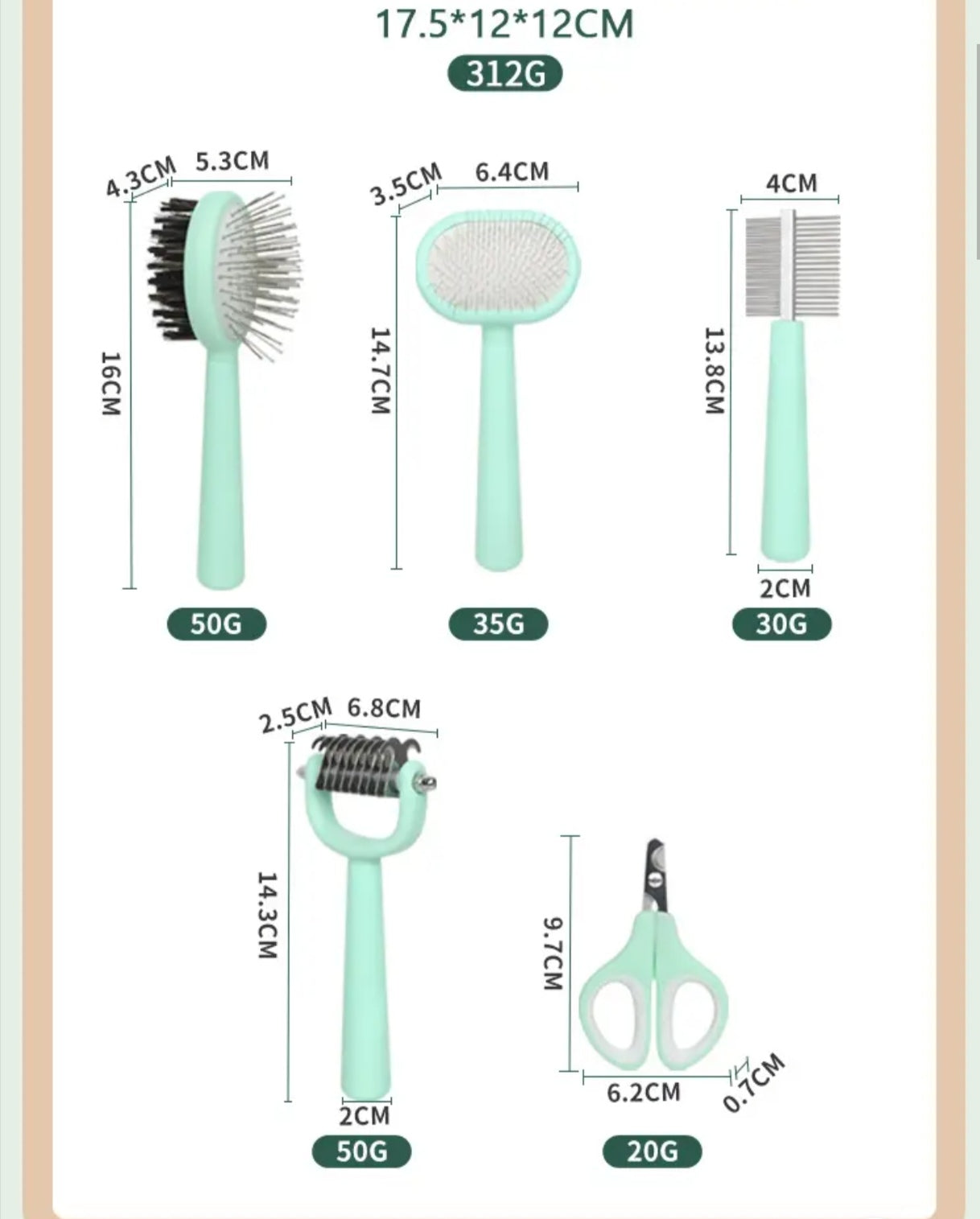 🧴 All-in-one grooming kit: Dual-sided de-matting comb + nail clippers + flea/mailer comb + pin comb.